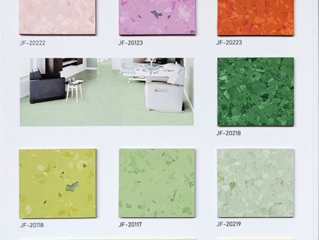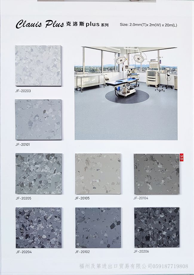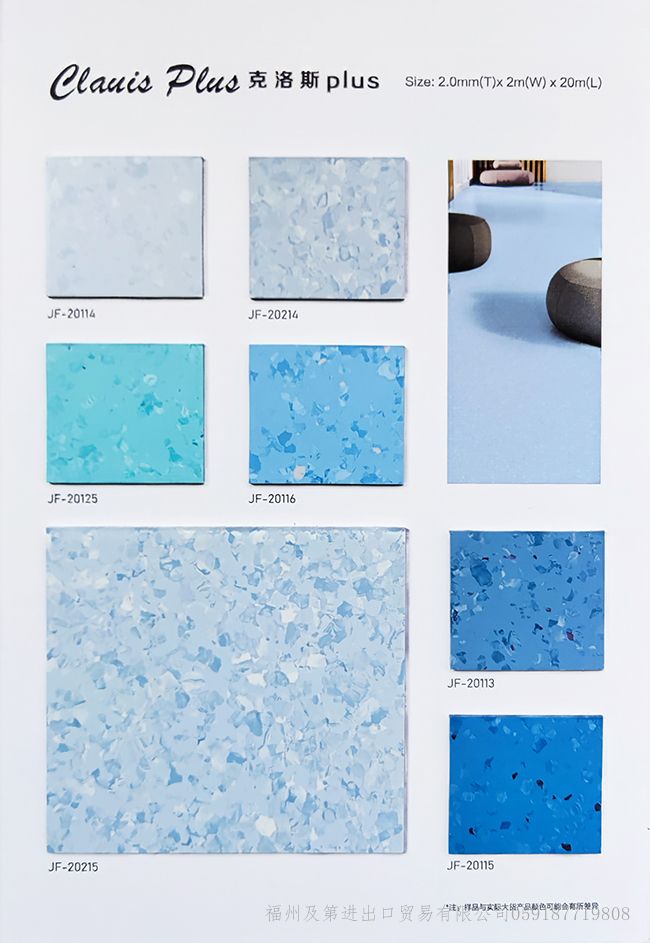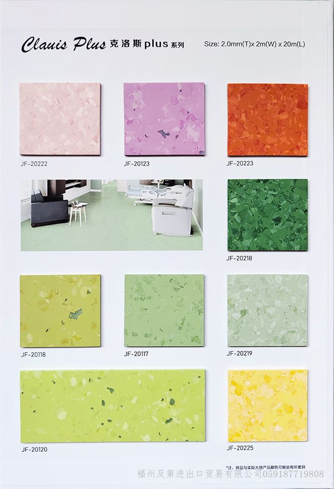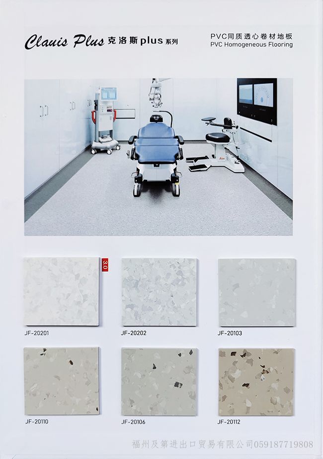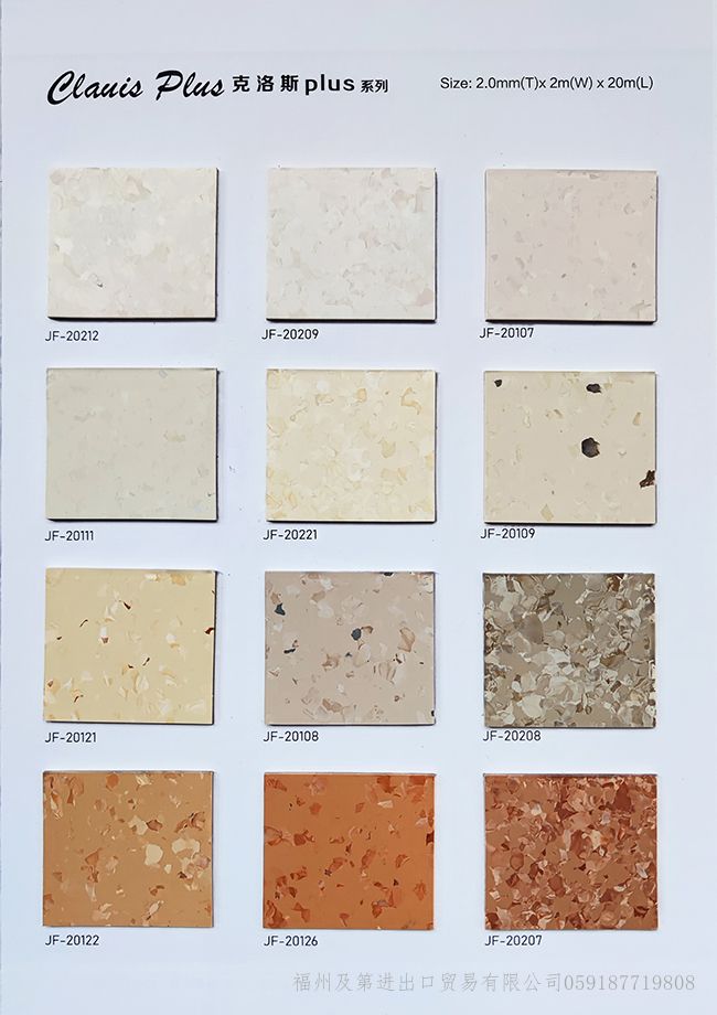 潔福品牌地板-同質透心地板顧名思義“從表面到底部的花紋一致的地板”整體為單層結構,耐磨系數高,使用年限高于其他多層PVC復合地板。常規庫存現貨的規格:2.0mm*2.0m*20/卷;花色多樣(上百種)可滿足各類型的設計需求,支持來樣定制加工廠生產:厚度2.5mm/3.0mm等;