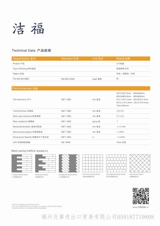 福州及第進出口貿易有限公司,專營 潔福地板 阿姆斯壯塑膠地板 LG塑膠地板 耐迪塑膠地板 其它品牌地板 輔料 等業務,有意向的客戶請咨詢我們,聯系電話:0591-87719808、83206468、13805067419(盧總)、13609539126(邱總)